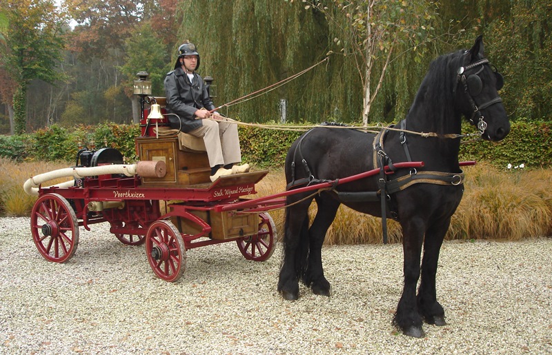 Een bijzondere wagen is onze antieke brandweerwagen. Een schitterende wagen om bijvoorbeeld optochten mee op te luisteren. De koetsier is gekleed in originele brandweerjas en helm. De wielen hebben nog het originele ijzeren beslag, wat een indrukwekkend geluid produceert wanneer dit rijtuig voorbij komt, getrokken door een Fries paard.
