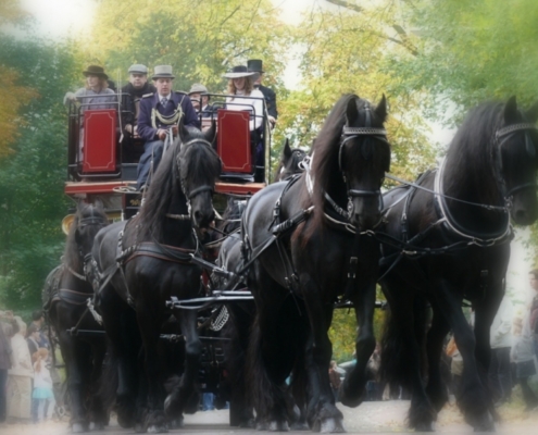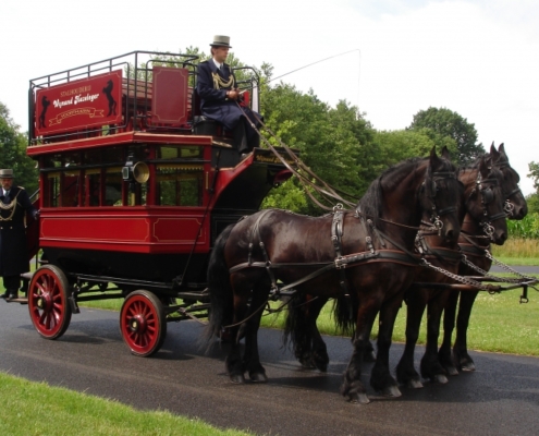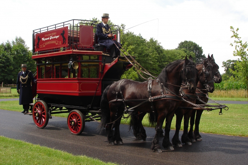 Ook bijzonder aan de dubbeldekker is dat deze wordt getrokken door drie, vijf of zeven Friesche paarden.