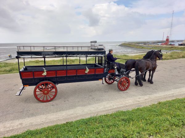 De Jan Plezier is een ideaal rijtuig voor het vervoeren van u gasten.In de koets zijn 16 zitplaatsen en achter de koetsier op het dak nog twee zitplaatsen met prachtig uitzicht. De ramen van dit rijtuig zijn zeilen en bij mooi weer kunnen deze opgerold worden, zodat u heerlijk in de ‘open lucht’ zit.