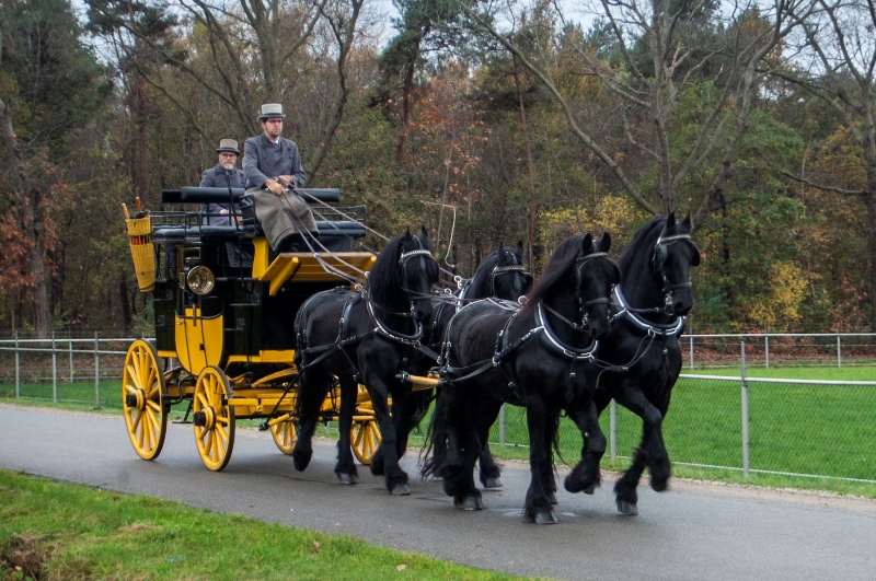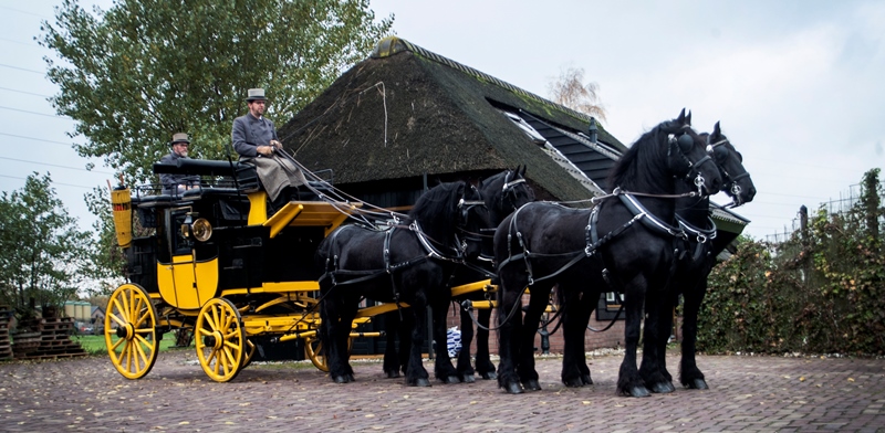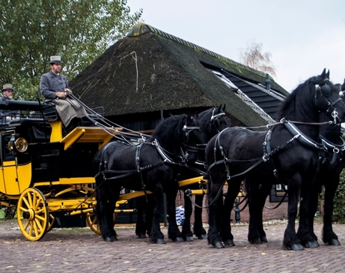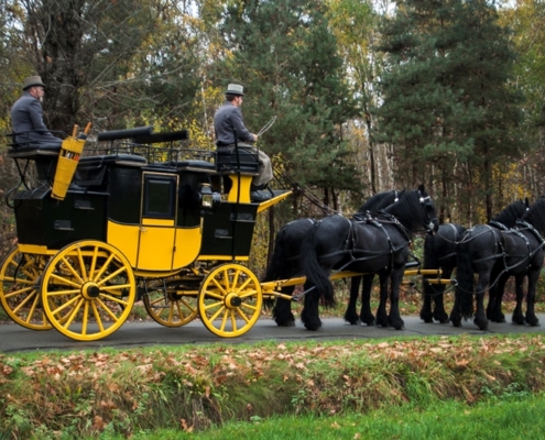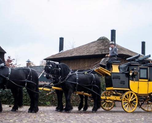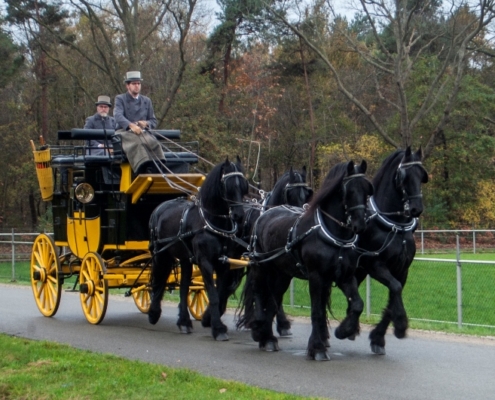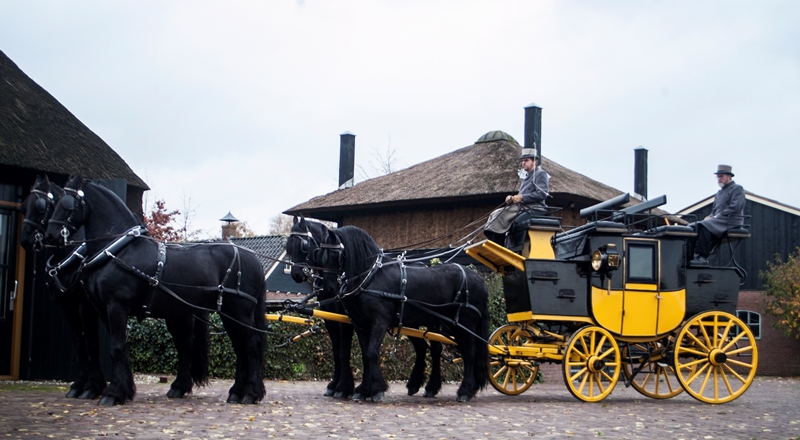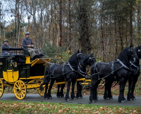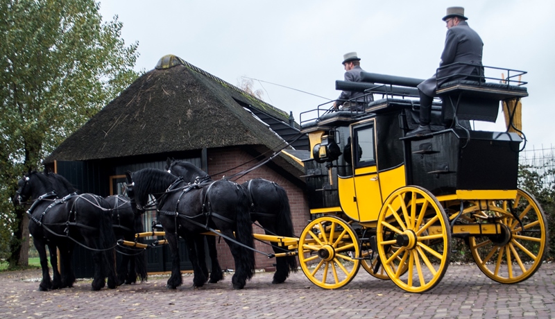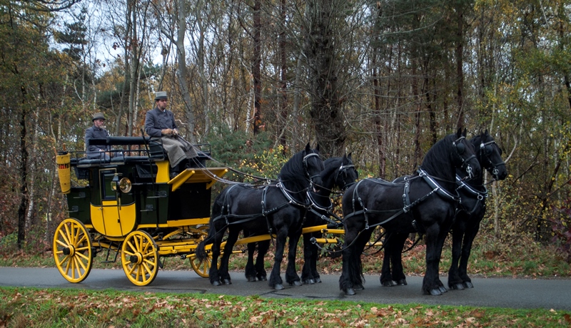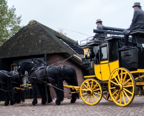 Een rit met de postkoets is echt een unieke ervaring. Bovenop zijn er acht zitplaatsen en beneden, in de koets, vier. Zit u ‘op het dak’ dan heeft u een prachtig uitzicht op de omgeving en de paarden. U kijkt van bovenaf op de paarden neer – vier of zes mooie zwarte Friezen die de koets trekken.